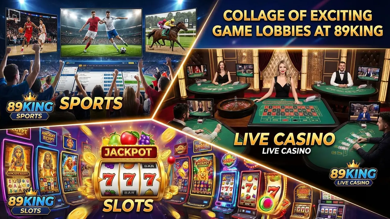Hình ảnh các sảnh game nổi bật tại 89King như Thể Thao, Live Casino và Nổ Hũ
