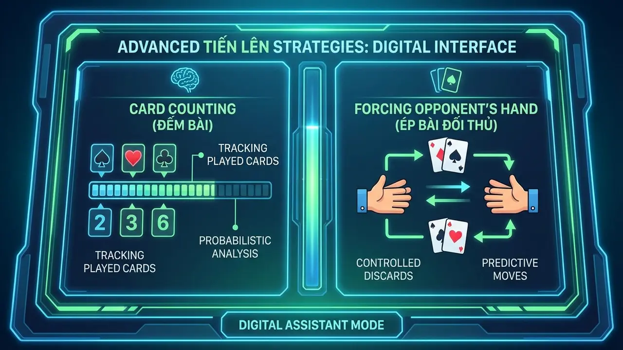Đây là nghệ thuật điều khiển thế trận. “Ép bài” là khi bạn ra những lá bài lẻ cao hoặc những bộ mà bạn đoán đối phương không có để buộc họ phải xé bộ của mình ra đỡ. Ví dụ, khi bạn cầm nhiều lá bài rác và một đôi A, bạn có thể liên tục đánh các lá lẻ cao (K, Q) để ép những người cầm đôi nhỏ hơn phải phá ra. “Nhử hàng” lại tinh vi hơn. Bạn có thể ra một bộ ba nhỏ (ví dụ bộ ba 4) để dụ đối thủ có Tứ quý hoặc Ba đôi thông phải ra tay, từ đó lộ ra “hàng” của họ cho bạn hoặc đồng đội xử lý.